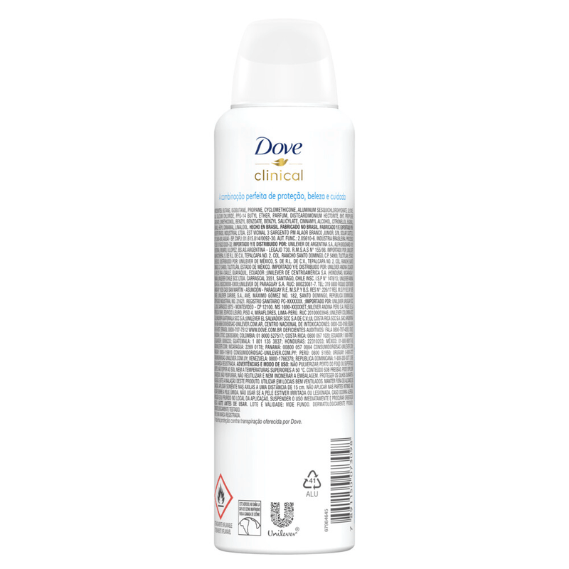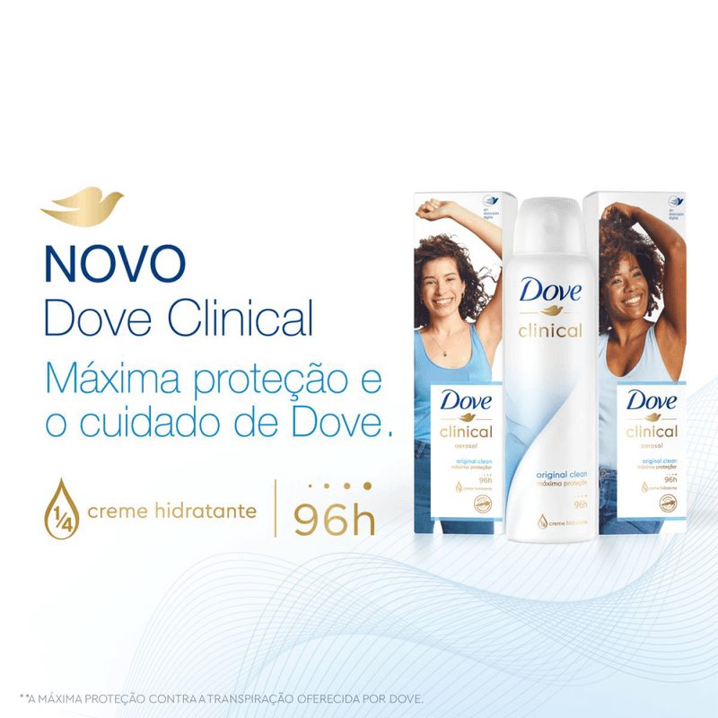 Dove Clinical Original Clean oferece nossa máxima proteção antitranspirante, já que sua fórmula conta com uma tecnologia inovadora para até 96 horas de proteção contra suor e mau odor. E só Dove Clinical oferece a exclusiva combinação com ¼ de creme hidratante que cuida da pele das suas axilas, enquanto oferece 3x mais proteção contra o suor do que um antitranspirante básico.